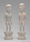 24 Standing pair of Ifugao bululs, the man 66 cm high, the man 66 cm high and woman 63 cm. Carved in simple naturalistic style, with an encrusted old patina. With old certification stamps of the National Museum: man with stamp 0018165 and woman with 0018166.