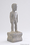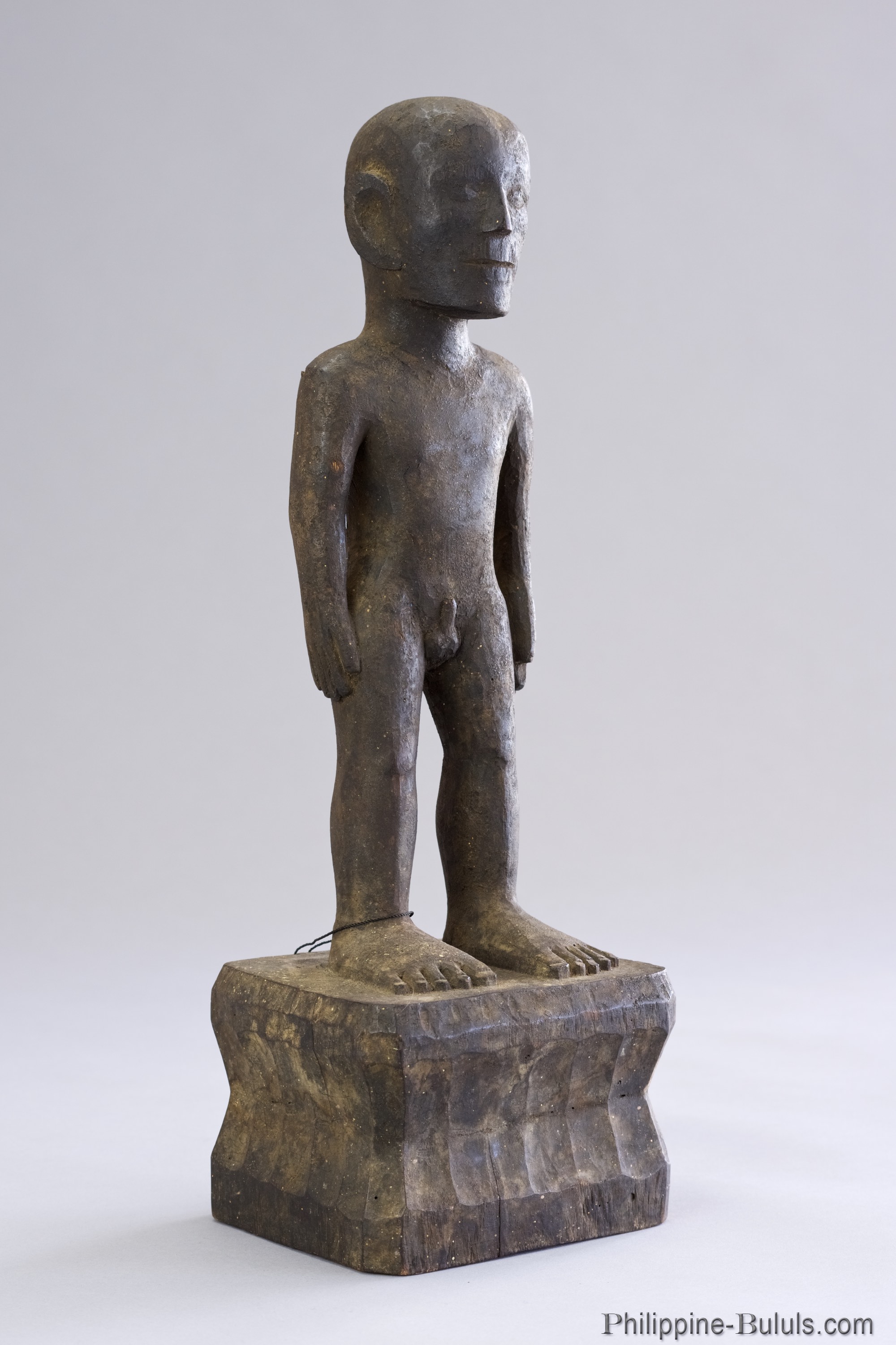 34 Standing pair of bululs from Banaue, the male 45 cm high and female 47 cm, with dark encrusted patina from sacrificial offerings of rice wine and pig's blood. The female has a hair peg on top of her head, with hair worn off. Said to be from Nabyon village, in Amganad bario, in municipal district of Banaue, ca 1930. Certified as a cultural property by National Museum of the Philippines, October 2003, stamps 0084797 and 0084798, with estimated date of 1920-40.