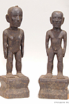 34 Standing pair of bululs from Banaue, the male 45 cm high and female 47 cm, with dark encrusted patina from sacrificial offerings of rice wine and pig's blood. The female has a hair peg on top of her head, with hair worn off. Said to be from Nabyon village, in Amganad bario, in municipal district of Banaue, ca 1930. Certified as a cultural property by National Museum of the Philippines, October 2003, stamps 0084797 and 0084798, with estimated date of 1920-40.