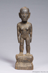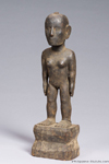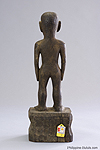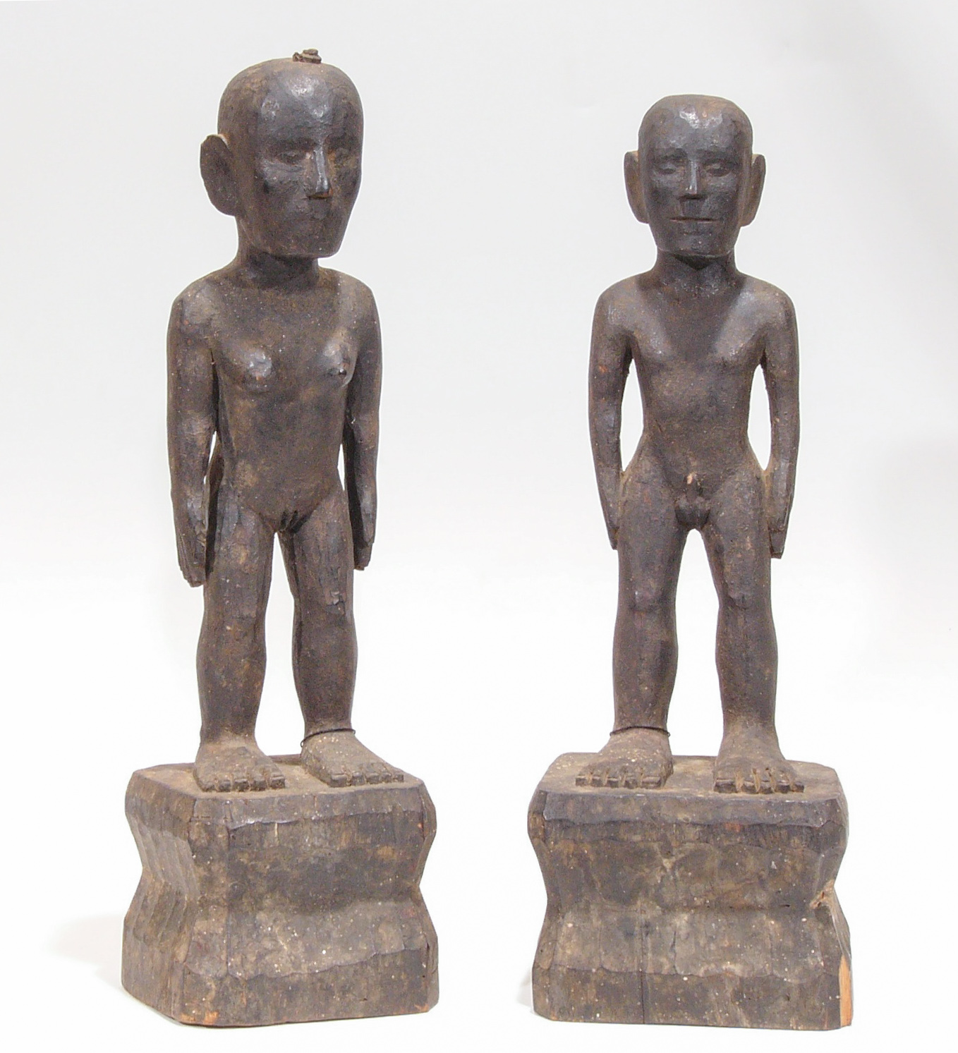 34 Standing pair of bululs from Banaue, the male 45 cm high and female 47 cm, with dark encrusted patina from sacrificial offerings of rice wine and pig's blood. The female has a hair peg on top of her head, with hair worn off. Said to be from Nabyon village, in Amganad bario, in municipal district of Banaue, ca 1930. Certified as a cultural property by National Museum of the Philippines, October 2003, stamps 0084797 and 0084798, with estimated date of 1920-40.