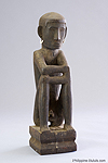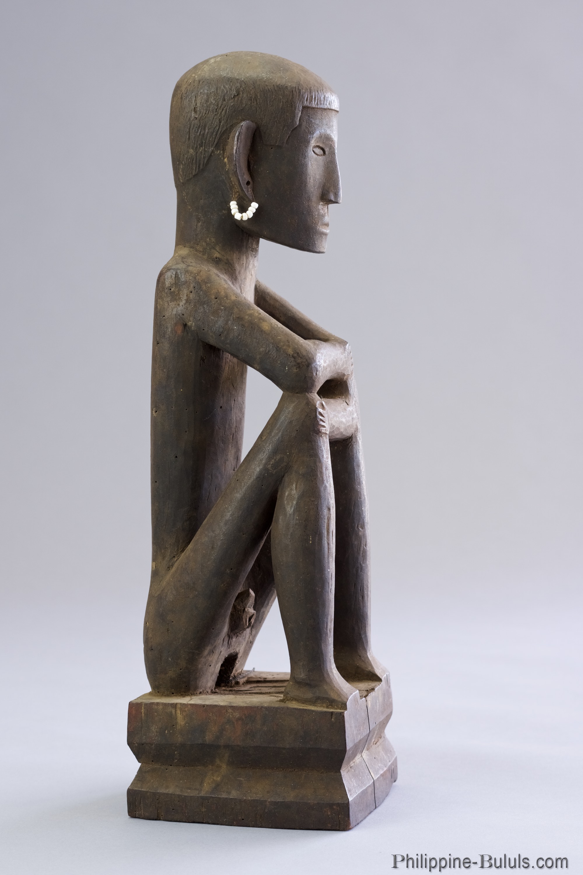 45 Seated male bulul from Lagawe, 44 cm H. It has a slim body and the head is realistically carved with hair shown and earrings. It comes from Buliwang bario, Lagawe region in Ifugao province. Certified as a cultural property by the National Museum of the Philippines, October 2003, with stamp 0084807 and an estimated date of ca 1940-50.