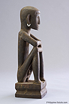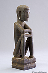 45 Seated male bulul from Lagawe, 44 cm H. It has a slim body and the head is realistically carved with hair shown and earrings. It comes from Buliwang bario, Lagawe region in Ifugao province. Certified as a cultural property by the National Museum of the Philippines, October 2003, with stamp 0084807 and an estimated date of ca 1940-50.