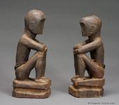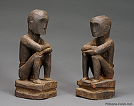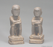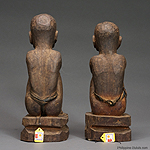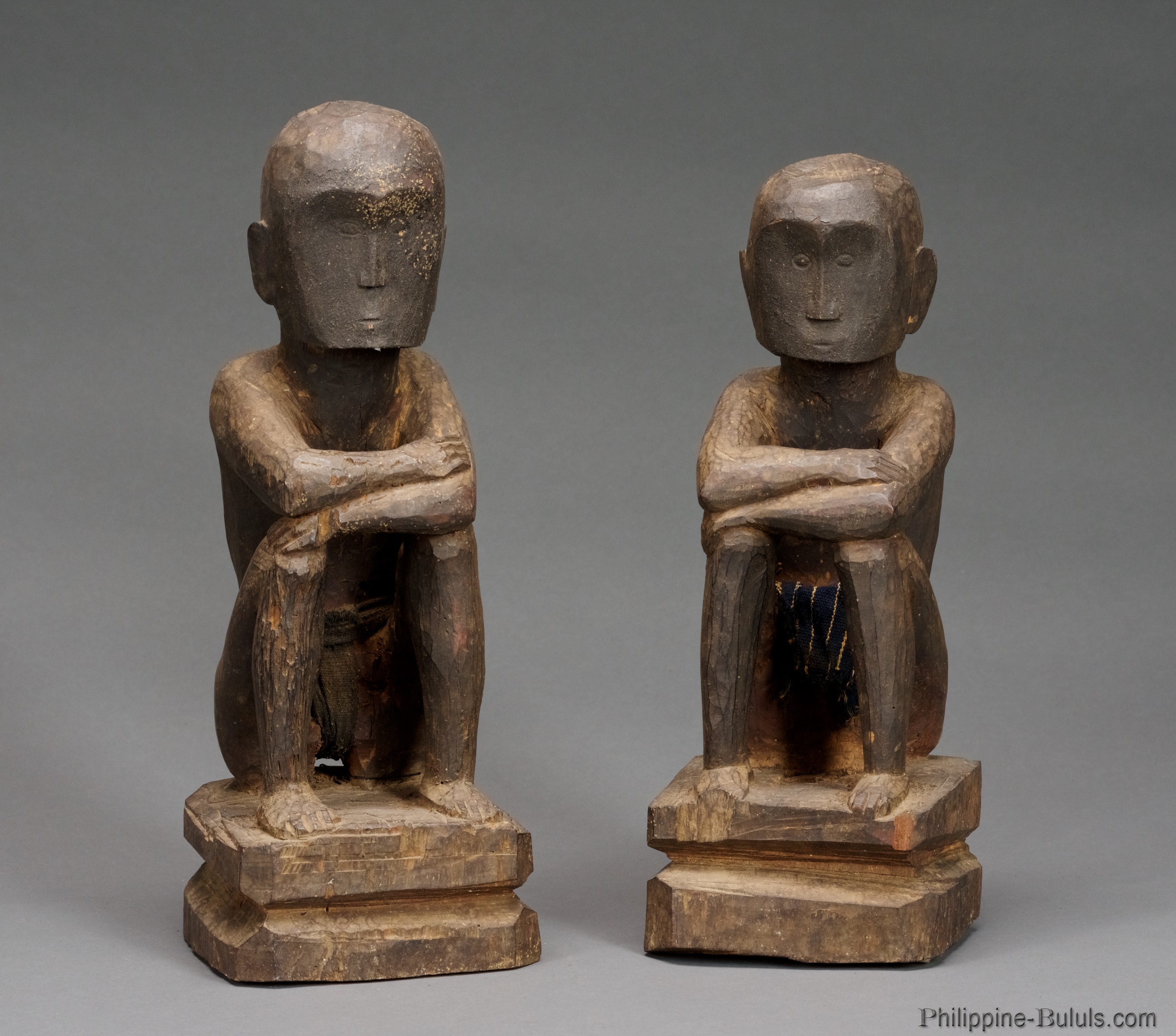 48 Seated pair of bululs, the male 39.5 cm and female 37.2 cm high, both with a rusty-brown patina of animal blood and rice wine. Both wear a loincloth. These bululs are in the Bunney style from Lagawe, in Ifugao province (see Anderson, figures 97 to 113). They were certified as genuine by the National Museum of the Philippines in October 2003, with stamps 0084799 and 0084800