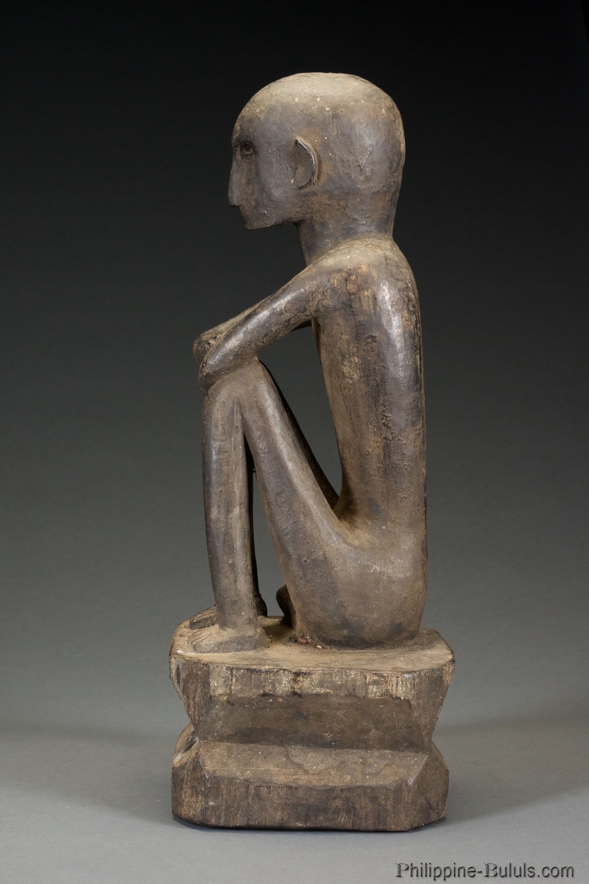 58 Seated male bulul from Banaue, 24" (61cm) H, well carved, in classic posture with thick black patina. It came from Ohaj village in Banaue district, Ifugao province. Certified as genuine by National Museum of the Philippines, October 2003, with stamp 0084804, with estimated age of circa 1920. It is carved from nara wood and weighs 9.0 kg. The NMP curator thought the square hour-glass square base was re-cut at bottom because the original base was uneven.