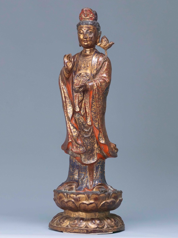 This bronze statue is lacquered and painted, 110 cm H, from China or Vietnam, ca. 1900. An inscription in Chinese characters on the lower back records the name of the donor. Guanyin is the name in China for the Bodhisattva Avalokitesvara, associated with compassion. During the Song dynasty (10-13th C) the style of Gunayin statues gradually evolved from their original male form into a more feminine form in China, and this is evident in this statue.