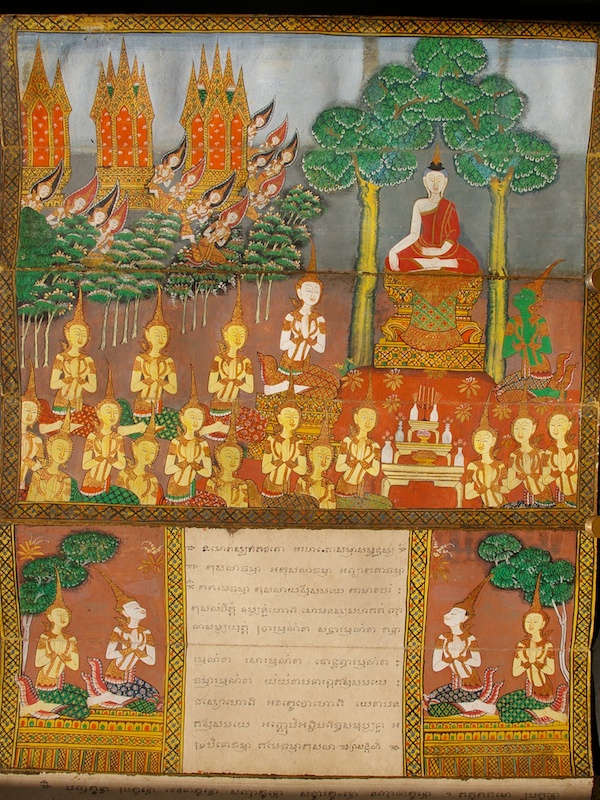 Buddhist manuscripts from Thailand were often lavishly illustrated with exquisite paintings of Buddhist tales and cosmology, and were traditionally used as preaching books. It is illustrated with religious paintings on 4 double-page full pictures, and 11 pairs of pictures at the sides on double pages. The first four pages have a large spectacular painting of the Buddha preaching in heaven. This shows the Buddha on his visit of three months to the Tavatimsa heaven of Buddhist legend. There he preached to the god Indra on his right, and his mother Mayadevi in white on his left. Indra, shown in green, is the supreme god and ruler of the thirty-three gods in Tavatimsa Heaven. According to Buddhist legend, Mayadevi in a previous incarnation was Pusati, the favorite consort of Indra. He requested her to be reborn as a human princess, eventually to become the wife of King Sanjaya of Sivi and the mother of the future Prince Siddhartha (aka Vessantara in Thailand), who became the Gautama Buddha. Mayadevi died soon after the Buddha's birth and returned to heaven. A multitude of bare-breasted maidens below, handmaidens to Mayadevi and the deities in heaven, pay respectful attention to the Buddha, their hands clasped together in the traditional sign of prayer and respect shown for superiors. Other deities, shown with halos and white skin, attend in the background at upper left.