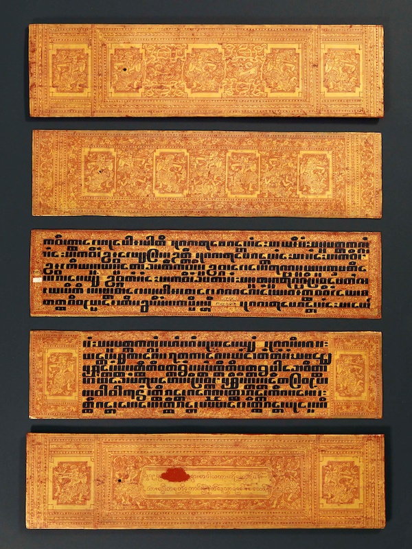 Burmese "bible", called a kamawar or kammavaca, with covers and all pages lacquered and richly gilded with gold foil, the covers decorated with designs of angels and kinaras, etc., each page 24" W and 6.5" H. It has 14 folios with Buddhist scriptures, although only 3 folios and the two covers are shown in the photo. A kammavaca volume contains extracts from the Theravadin Buddhist Vinaya (rules of conduct and discipline in a monastery) relating to specific ceremonies associated with monks. The folios are made of pieces of cloth coated with many layers of lacquer, the outermost layers of lacquer are mixed with cinnabar for an orange color, then the pages are covered with gold foil, the square letters are written in a thick black lacquer, and the background gold foil is etched with various designs.