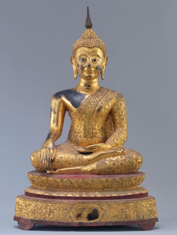 Bronze statue of the Buddha seated in the "bhumisparsa mudra" posture, with gold foil gilding, 34"H and 21.5"W. This statue is from Thailand, late 19th century, in the Bangkok-Ratanakosin style.